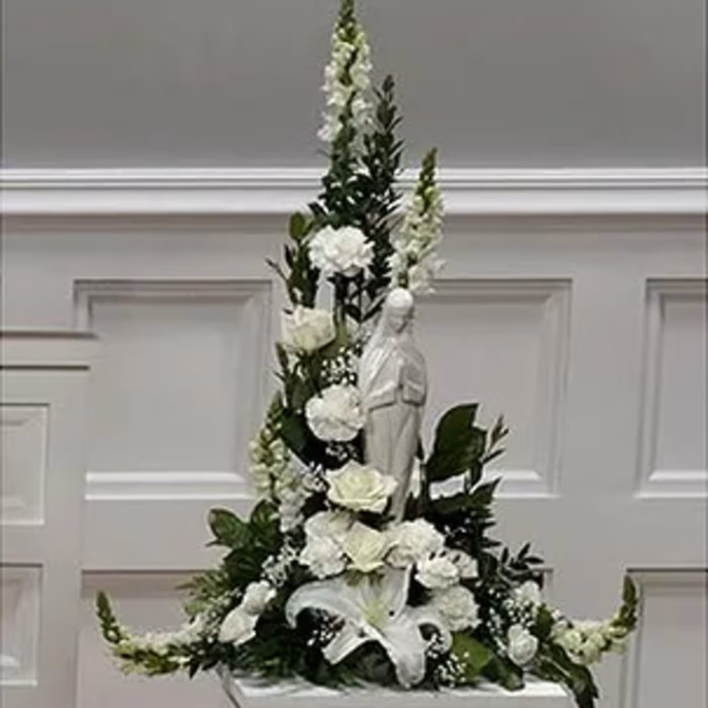 Pedestal arrangement with all white flowers including snapdragons, lilies, carnations, roses and babies breath. Statue may vary from one pictured