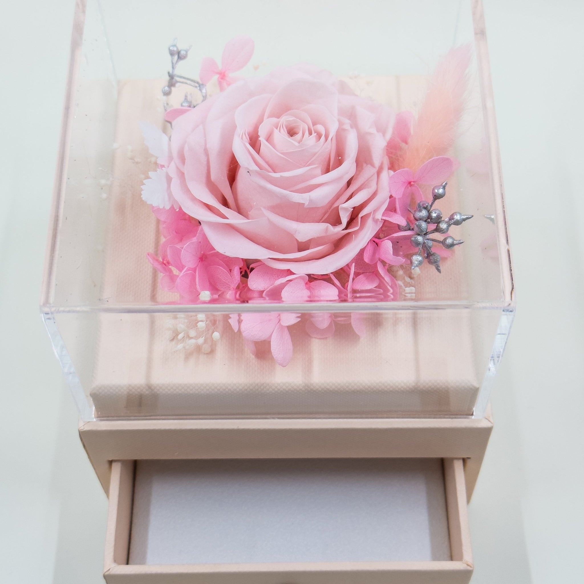 Add a touch of elegance to your jewelry collection with our preserved rose jewelry box, the perfect addition to any timeless piece. This stunning jewelry box features a real preserved rose, meticulously arranged with other beautiful preserved flowers, all encased in a clear vinyl cover. Beneath the floral display, a discreet drawer offers a stylish and practical storage solution for your favorite jewelry.
